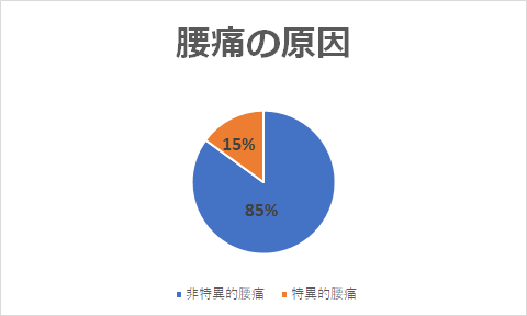 「医師の診察及び検査で腰痛の原因が特定できるものを「特異性腰痛」、厳密な原因が特定できないものを「非特異性腰痛」といいます。病院の外来を受診する腰痛患者のほとんど(85%)は原因の特定できない「非特異性腰痛」です。